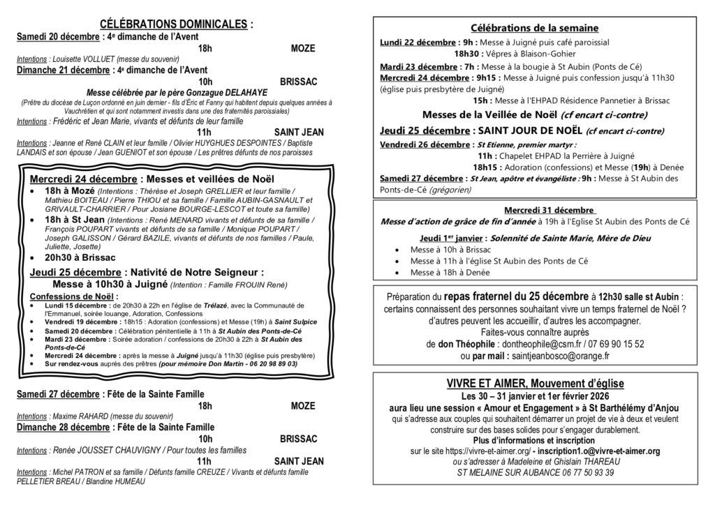 Pour recevoir pleinement la grâce de Noël, nous aussi devons-nous préparer. Dire « oui » à Dieu, c’est accepter de laisser de la place en nous pour sa lumière, c’est choisir d’accueillir sa présence dans les petits riens de notre quotidien. Cela peut passer par un temps de prière, un geste de réconciliation, ou simplement par l’attention portée à ceux qui nous entourent. Chaque « oui » offert, aussi modeste soit-il, nous rend disponibles à la joie de l’Incarnation. Que cette fête soit pour chacun l’occasion de renaître à la confiance et à la joie de l’Incarnation, en osant, comme Marie, dire « oui » à l’amour qui se donne.