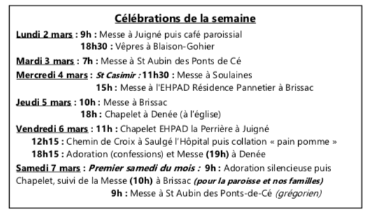 Mardi 17 mars : St Patrice, évêque : 7h : Messe à St Aubin des Ponts de Cé Mercredi 18 mars : St Cyrille, évêque et docteur : 9h15 : Messe à St Melaine